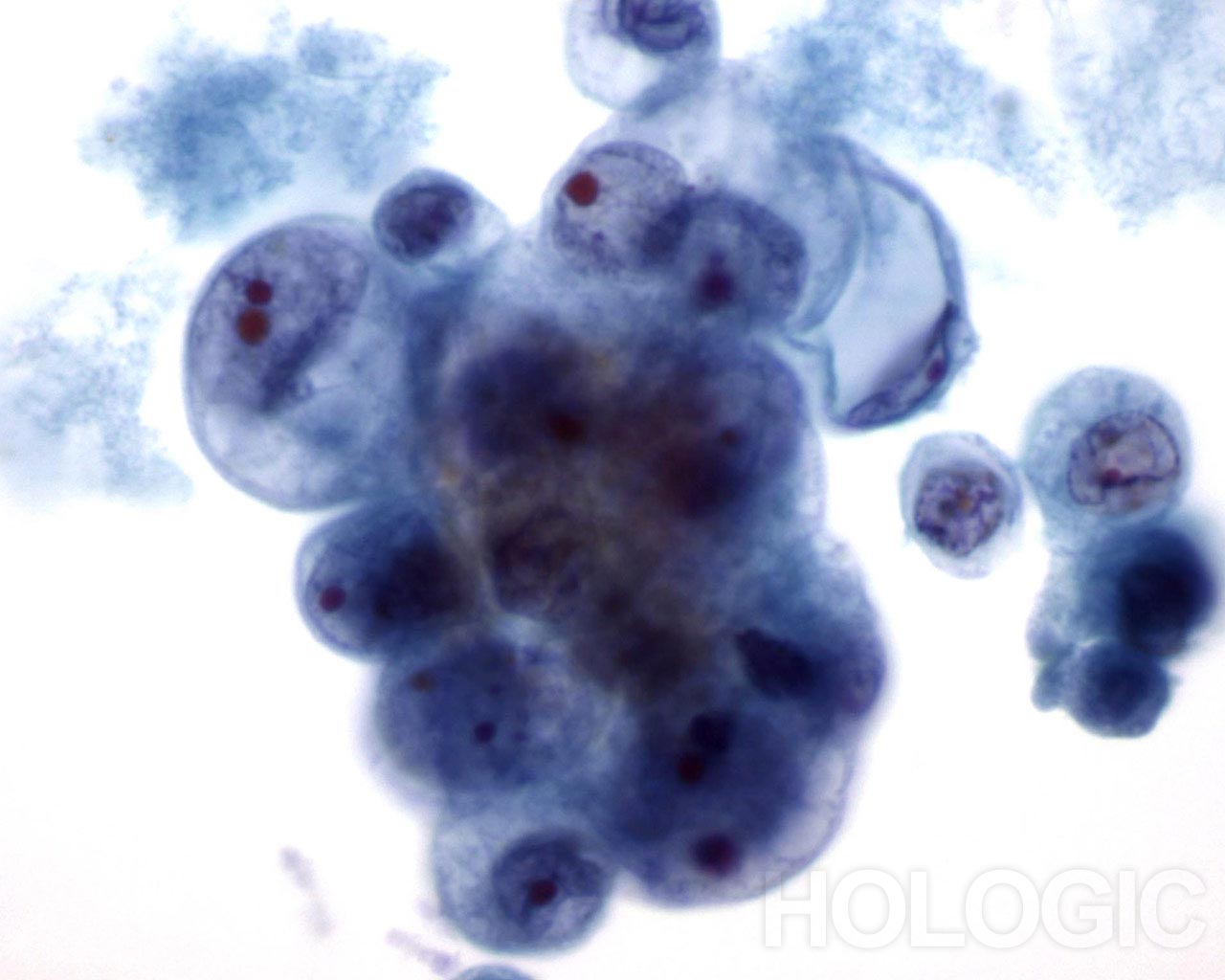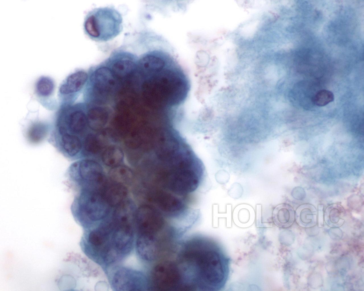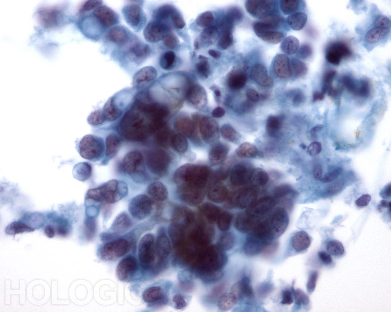 This field shows a hyperchromatic cluster of epithelial cells with much cellular debris in the background, suspicious for carcinoma.