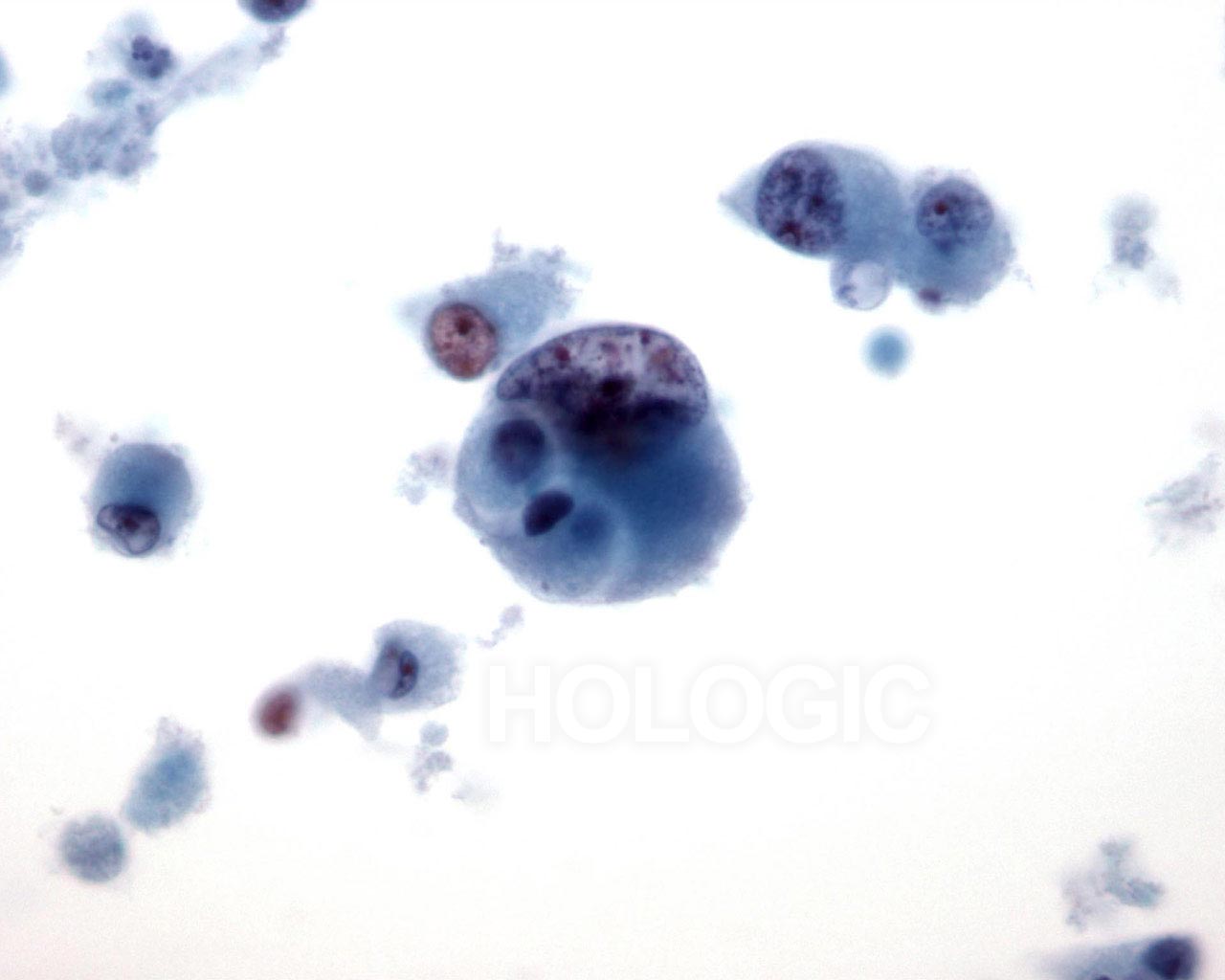 The malignant cells in this field are multinucleated with pale nuclei showing clumped and cleared chromatin. 60x