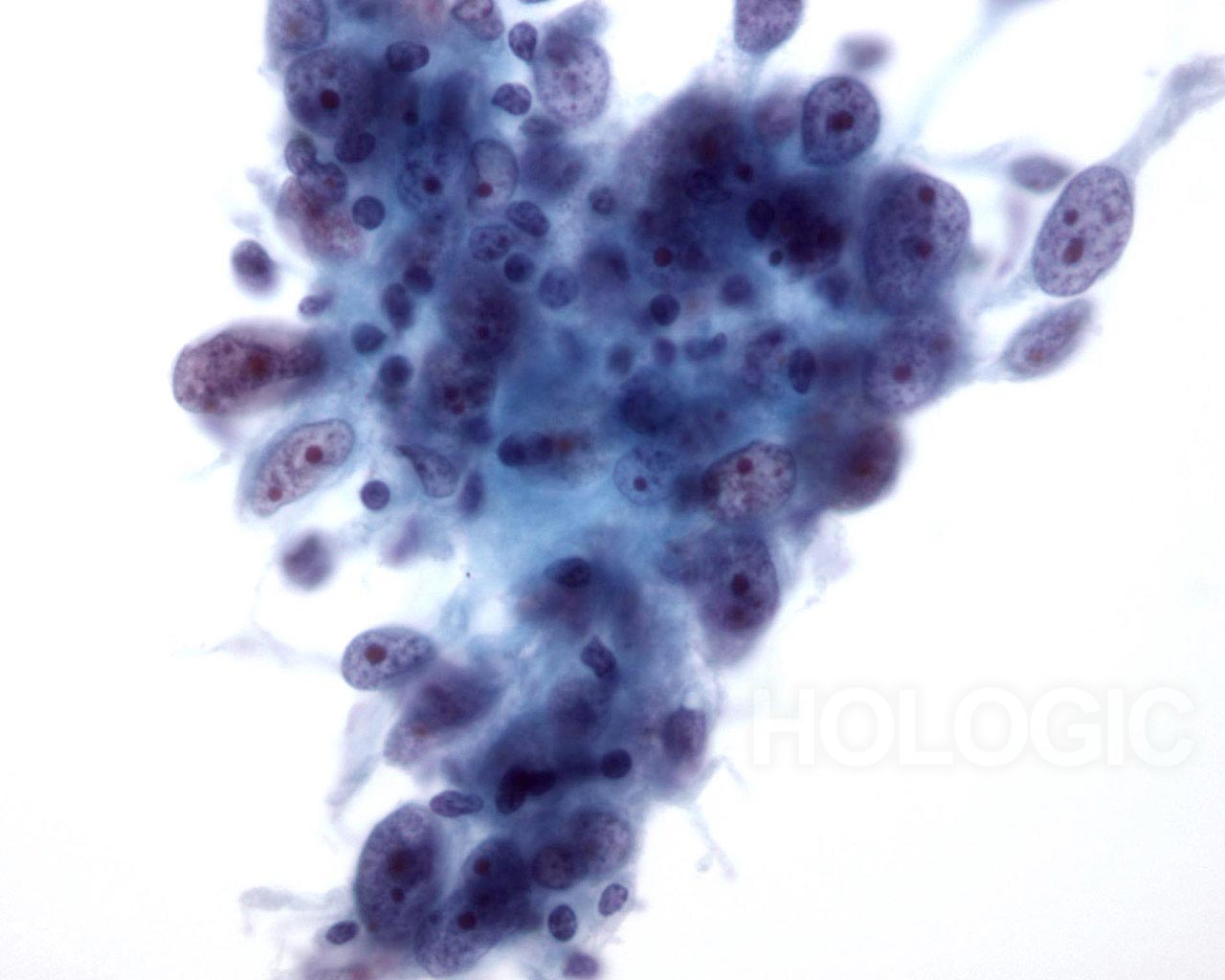 This cluster of cells shows large central nucleoli and abnormal chromatin. Lymphocytes are also noted.
