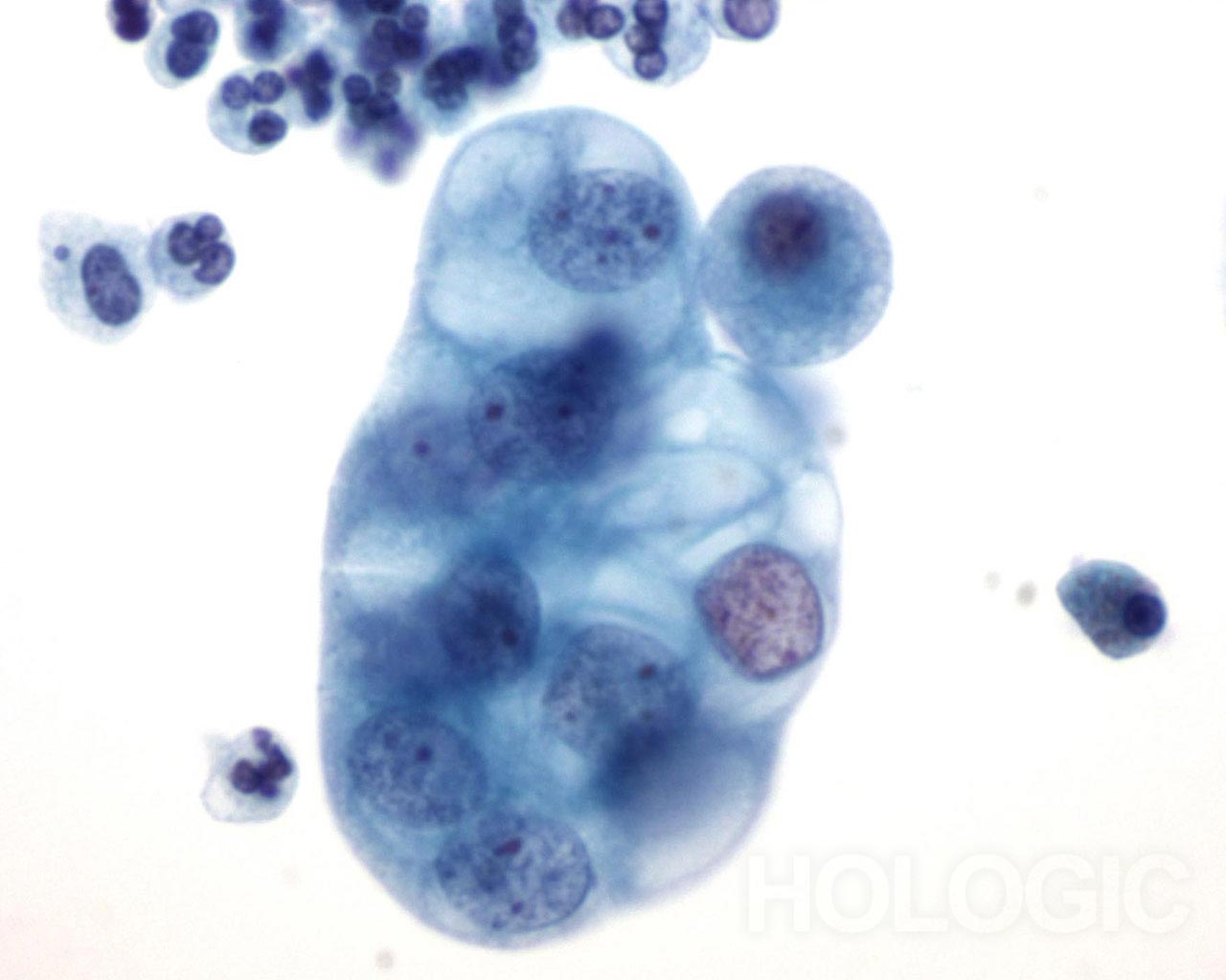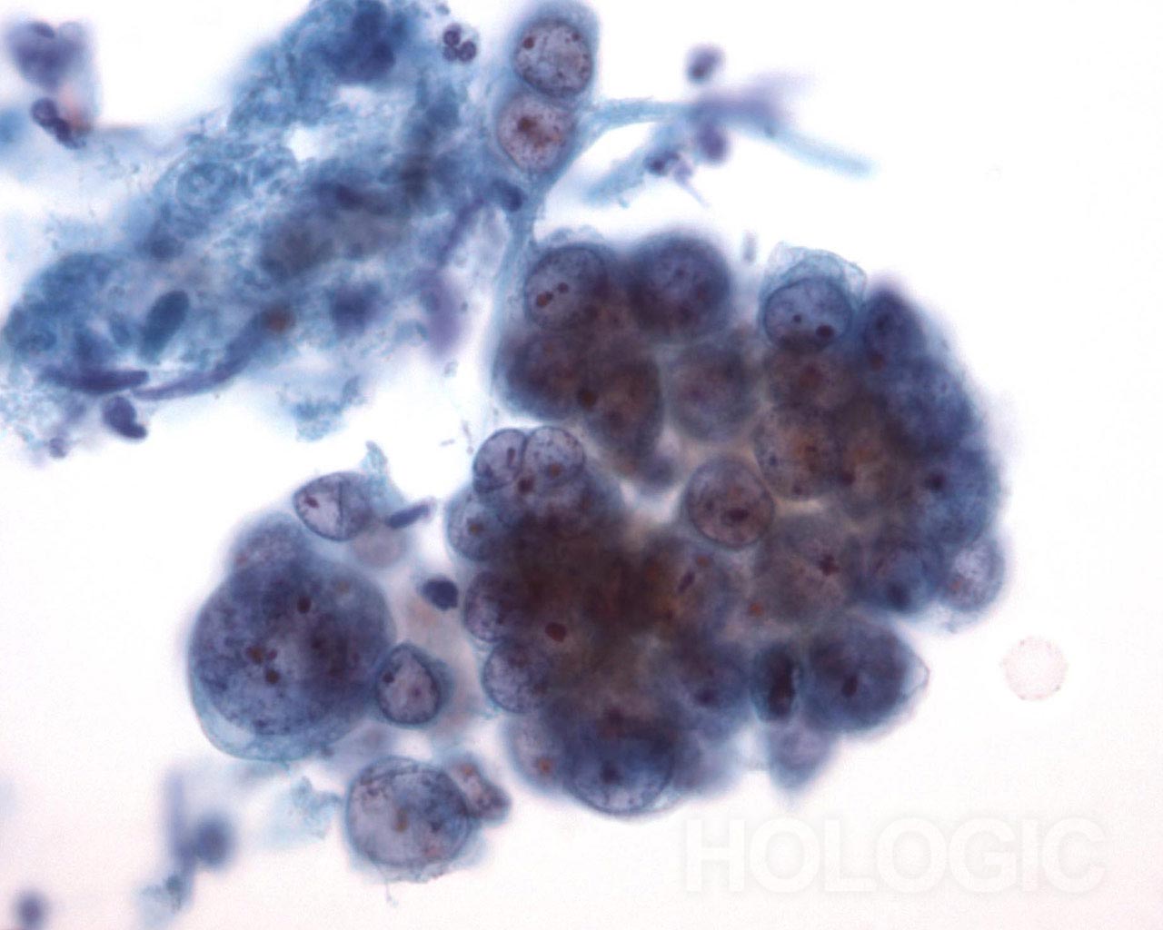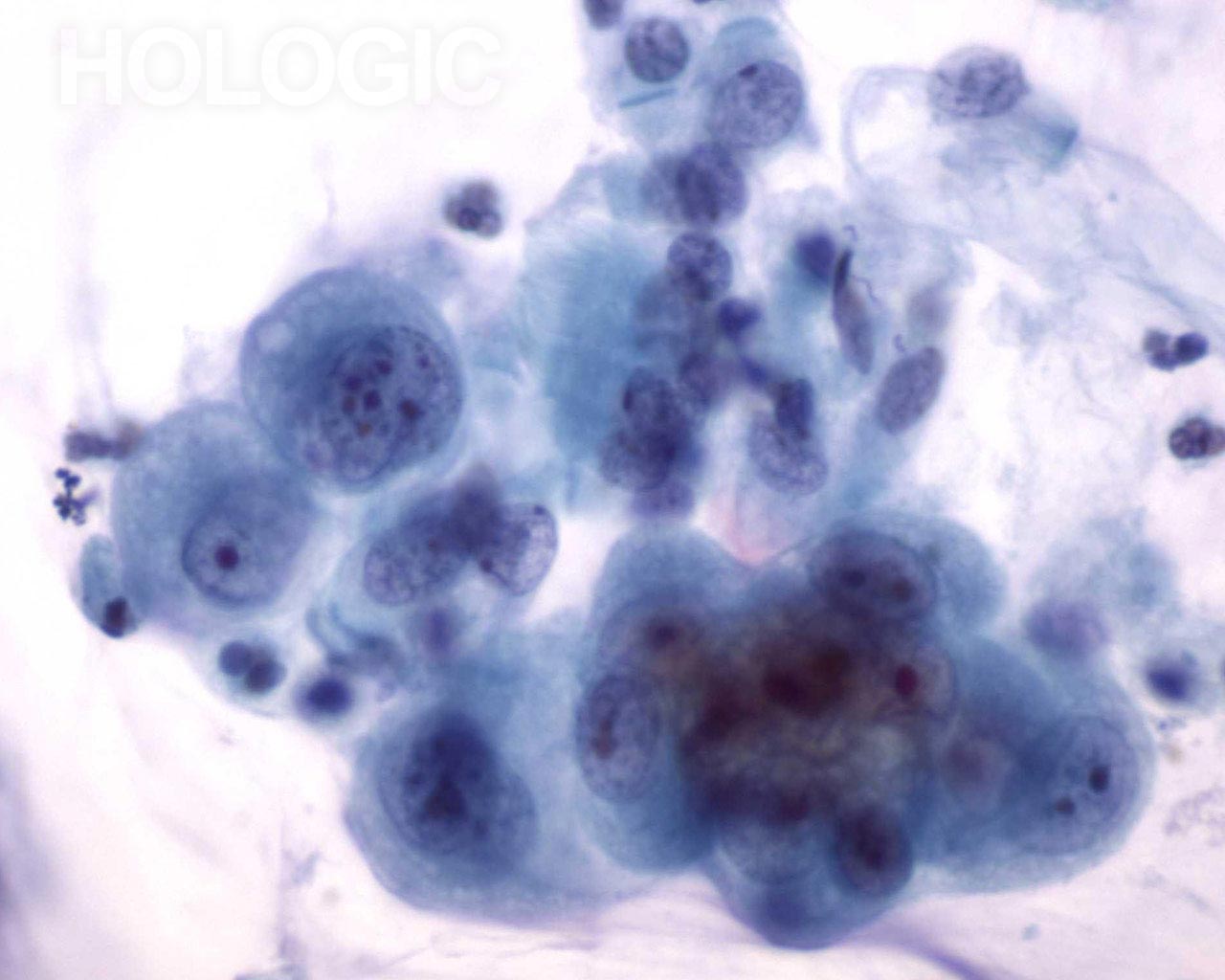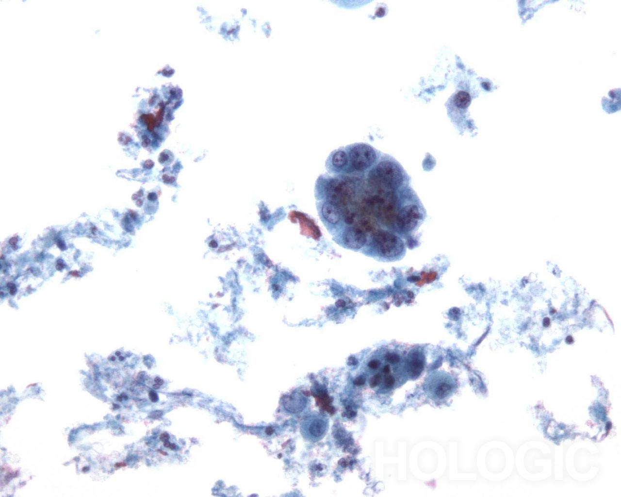 This sputum sample shows a cluster of vacuolated cells.