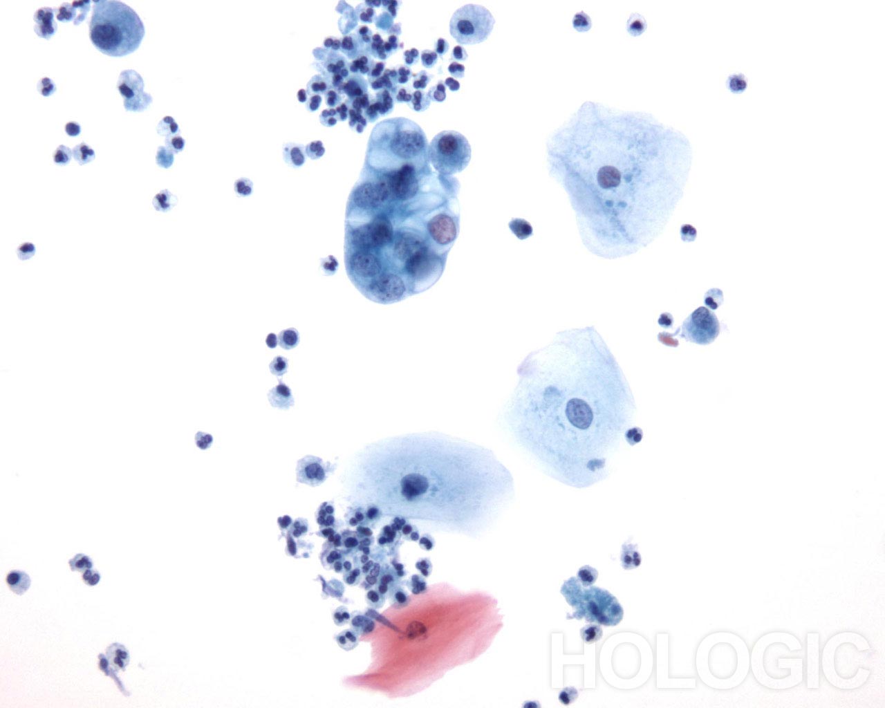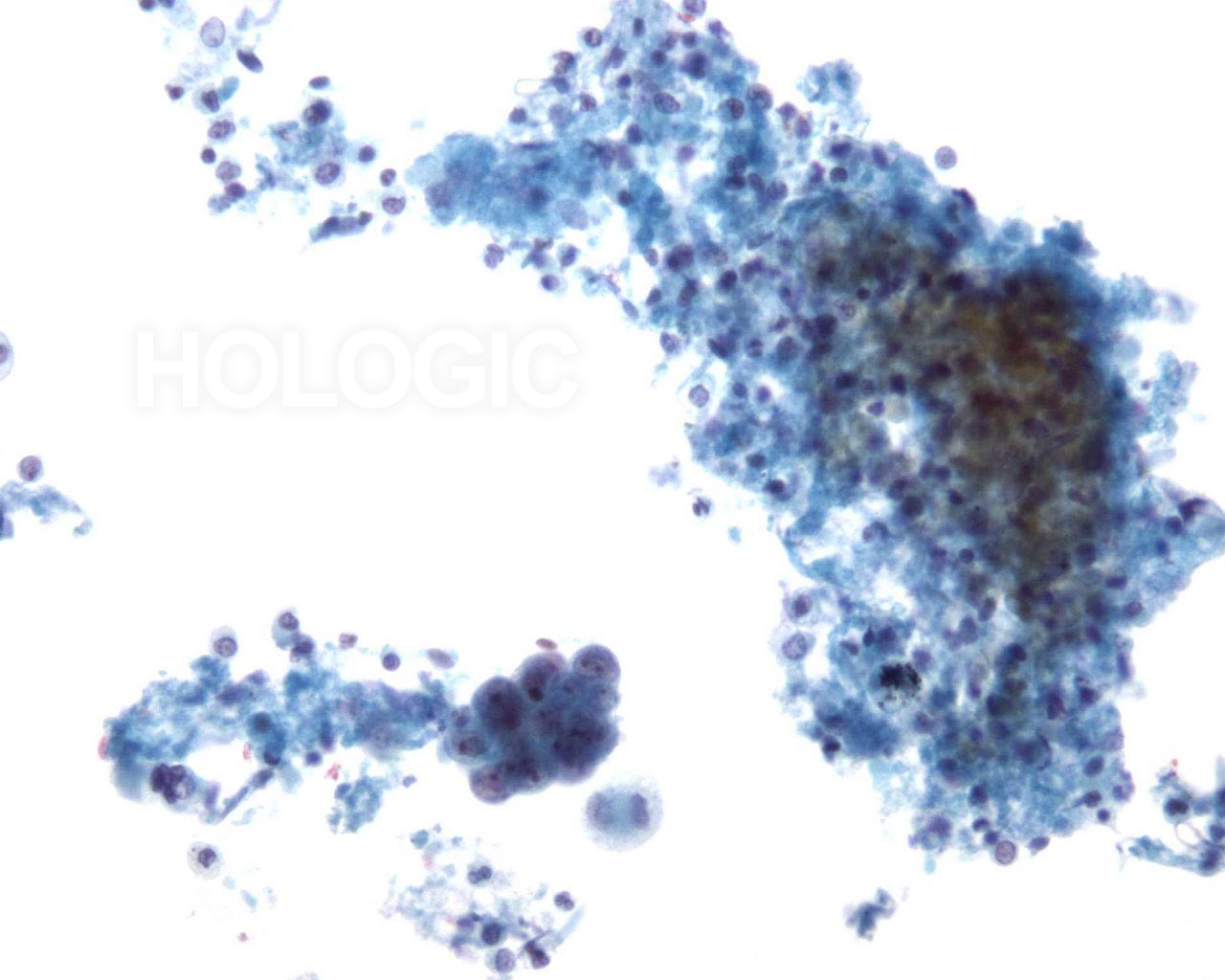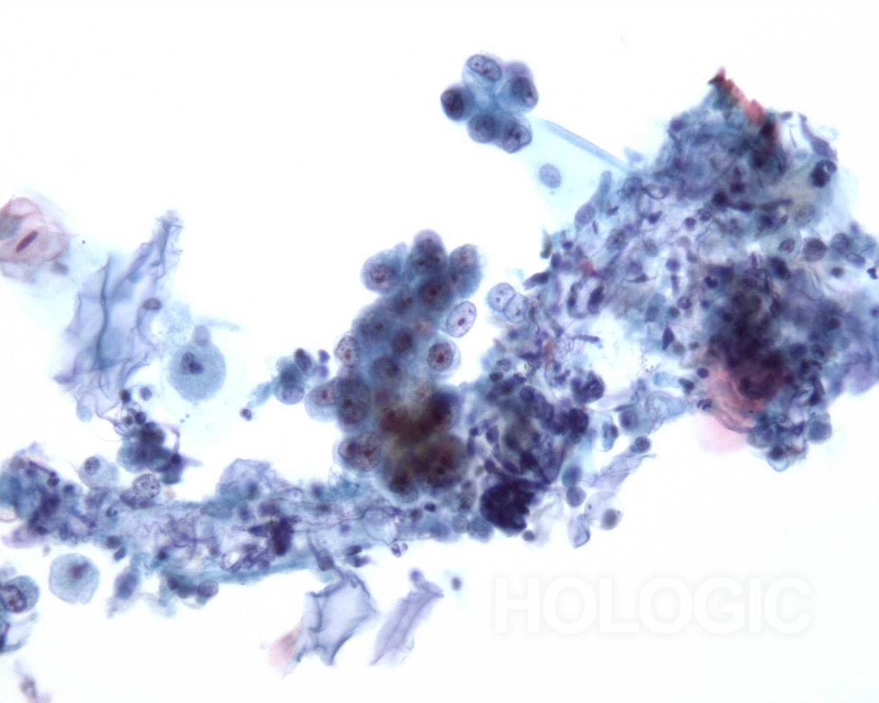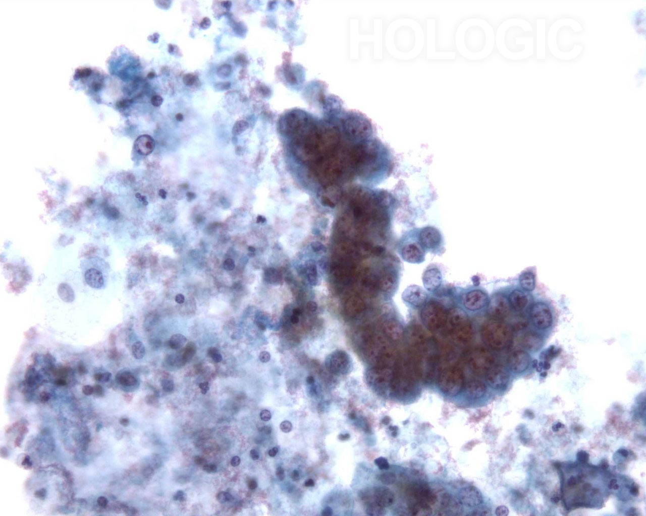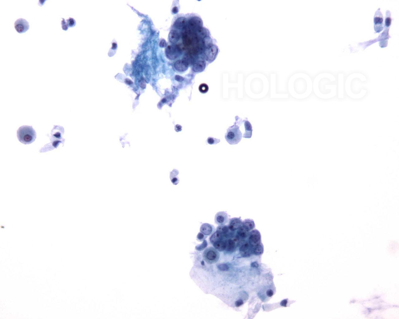 This sputum sample shows a cluster of vacuolated cells.