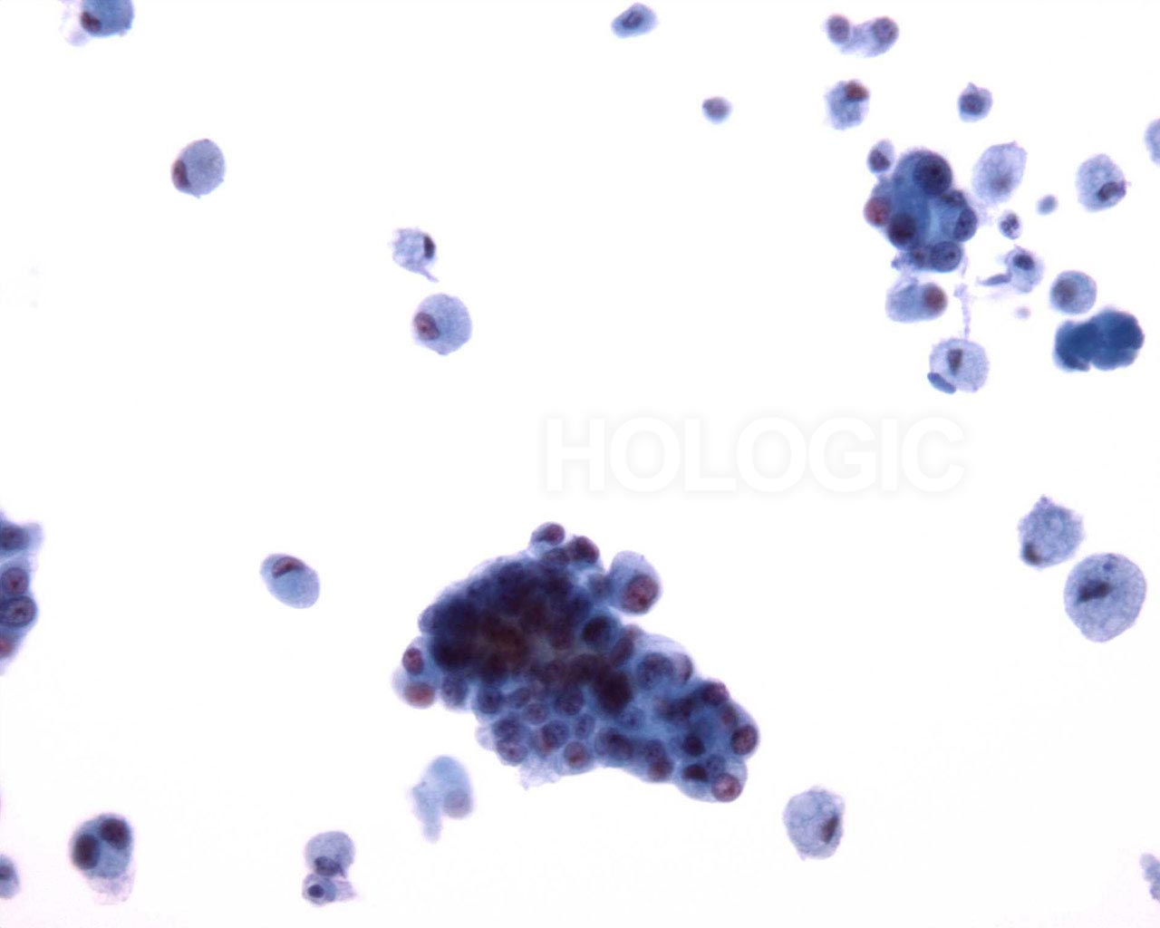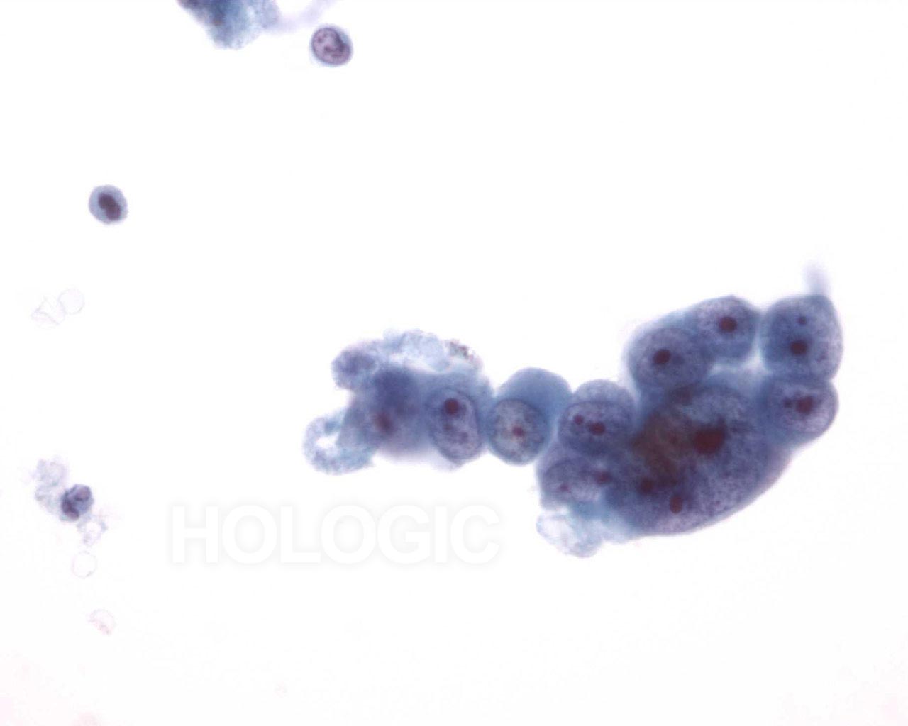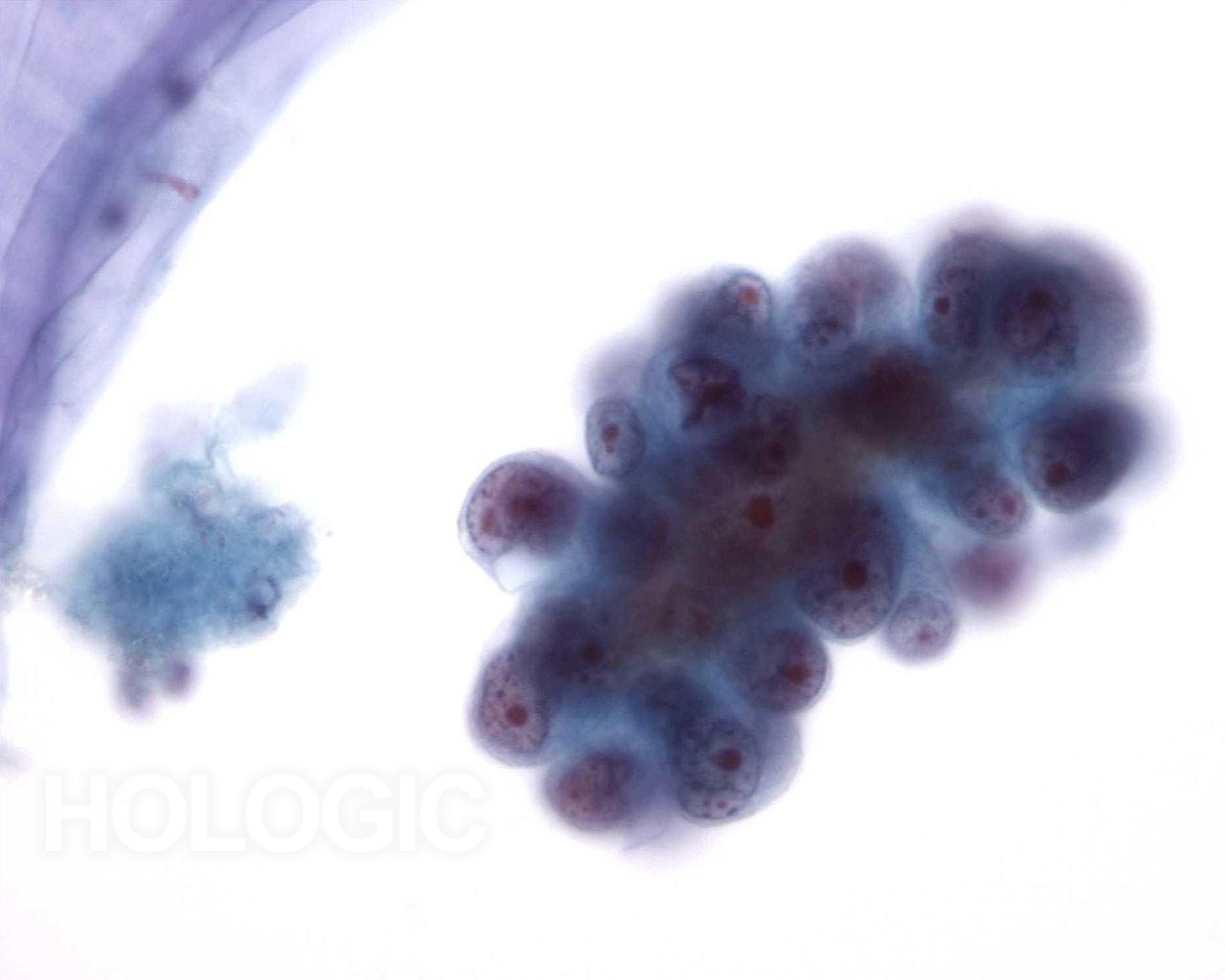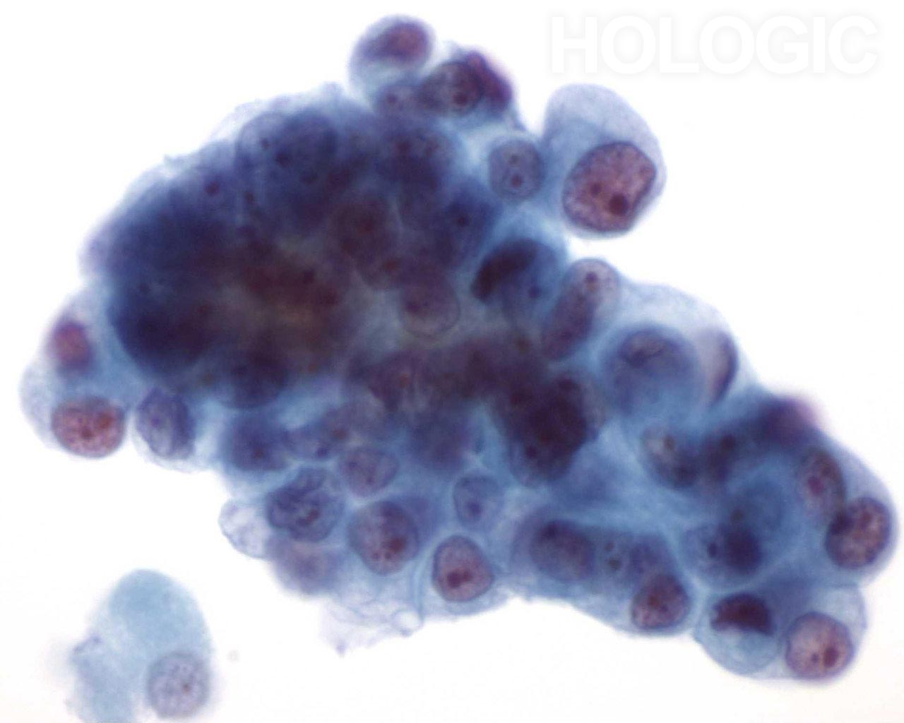 Higher magnification shows relatively bland uniform nuclei in the cell cluster.