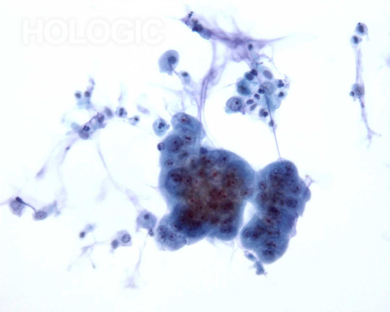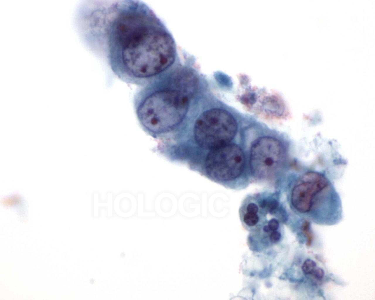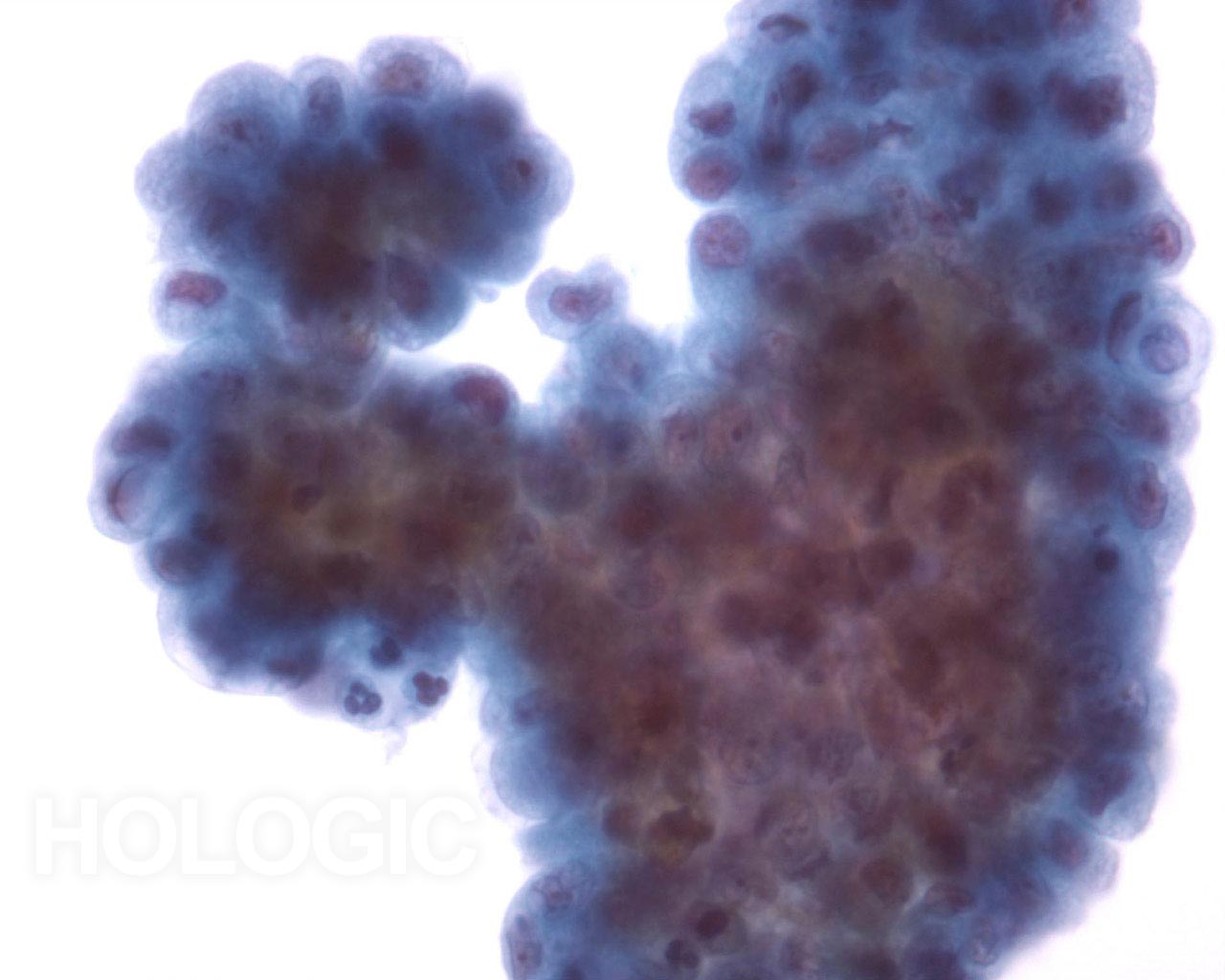 Cells with vacuolated cytoplasm are seen at the edge of the cluster.